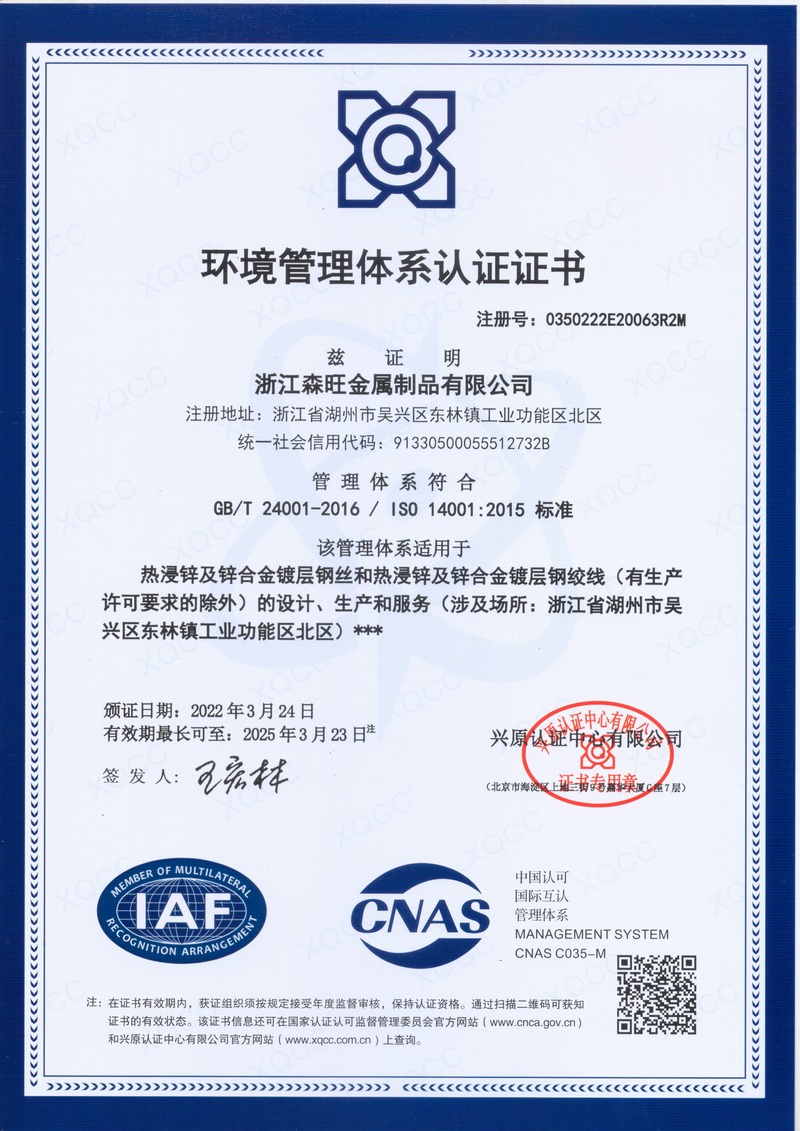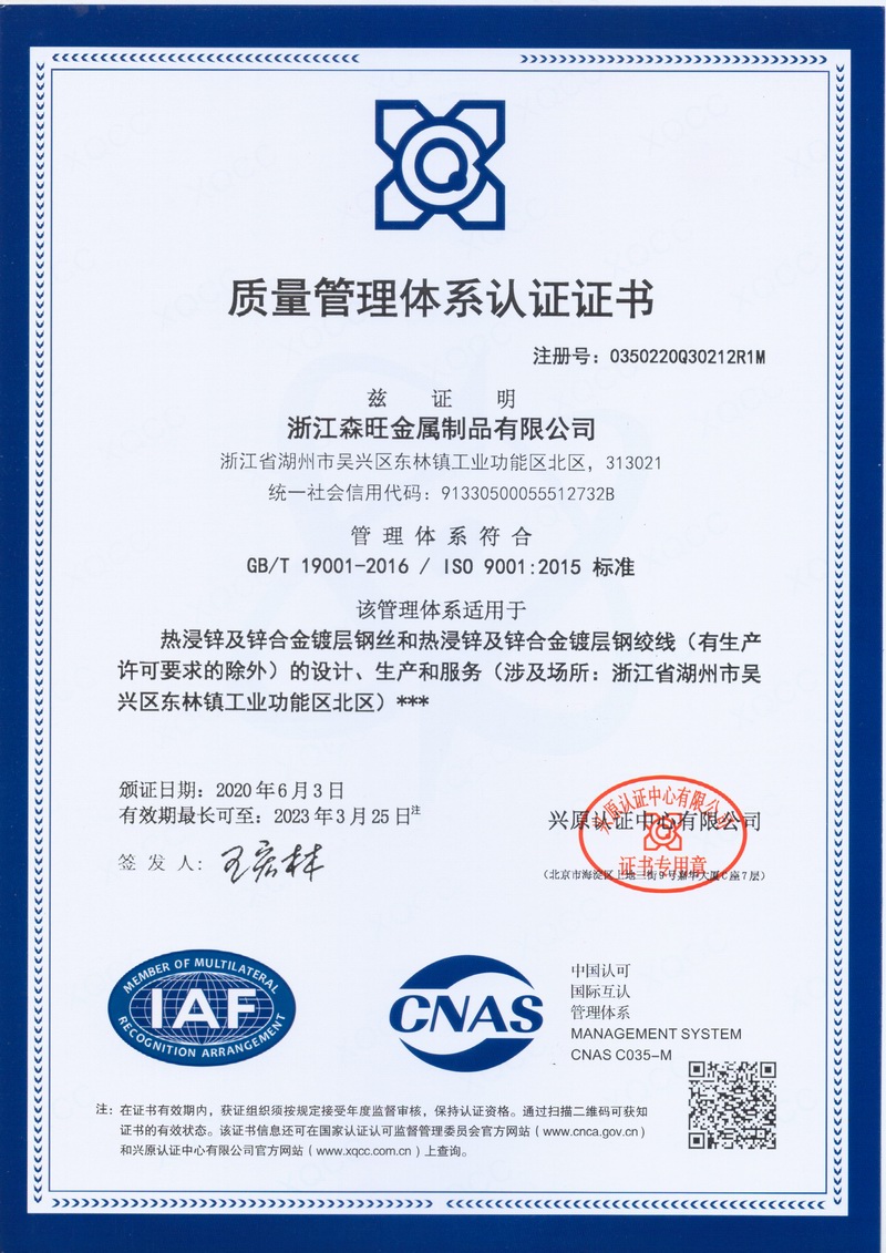 浙江森旺金屬制品有限公司成立于2012年,坐落湖州市吳興區(qū)東林鎮(zhèn)工業(yè)功能區(qū)。公司專業(yè)從事各類鍍鋅鋼絲、鋼絞線等產(chǎn)品的開發(fā)及生產(chǎn)。目前產(chǎn)品已廣泛應(yīng)用于各類通信光電纜,電力輸送,電氣化鐵路工程,各類堤壩防護及農(nóng)業(yè)溫室等工程領(lǐng)域。公司秉承“追求卓越品質(zhì),創(chuàng)建卓著信譽”的經(jīng)營理念,始終堅持專業(yè)化、規(guī)模化的經(jīng)營模式。